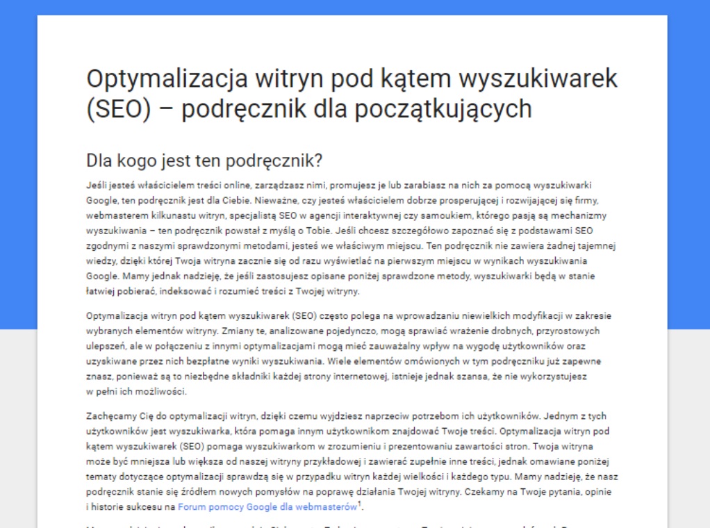 Zgromadzone pod jednym adresem podstawowe informacje na temat optymalizacji strony. Po raz pierwszy opublikowany w 2008 roku podręcznik został w ubiegłym roku gruntownie odświeżony i wzbogacony o sekcje dotyczące danych strukturalnych i stron mobilnych. Mimo że poradnik nie zawiera przełomowych informacji, warto się z nim zapoznać, aby dowiedzieć się, co Google rozumie pod pojęciem dobrych praktyk SEO.