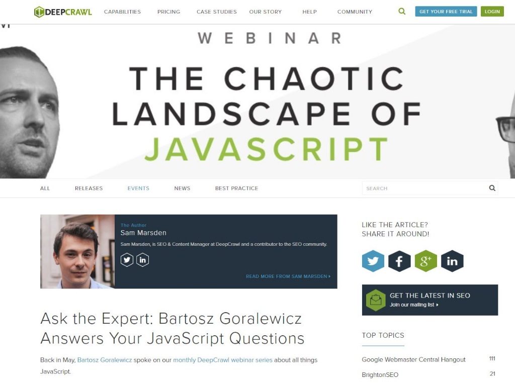 Wartościowym źródłem wiedzy o SEO jest blog prowadzony na stronie crawlera Deep Crawl. Artykuły na stronie dotyczą przede wszystkim technicznego SEO, w tym tematów takich jak budowa adresów URL, indeksowanie strony czy przekierowania. Dodatkowo blog wybiera najważniejsze i najciekawsze informacje z Google Webmaster hangouts, o których wspominaliśmy w poprzednim artykule, dzięki czemu żadna nowa wiadomość płynąca od pracowników Google nie zostaje pominięta.
