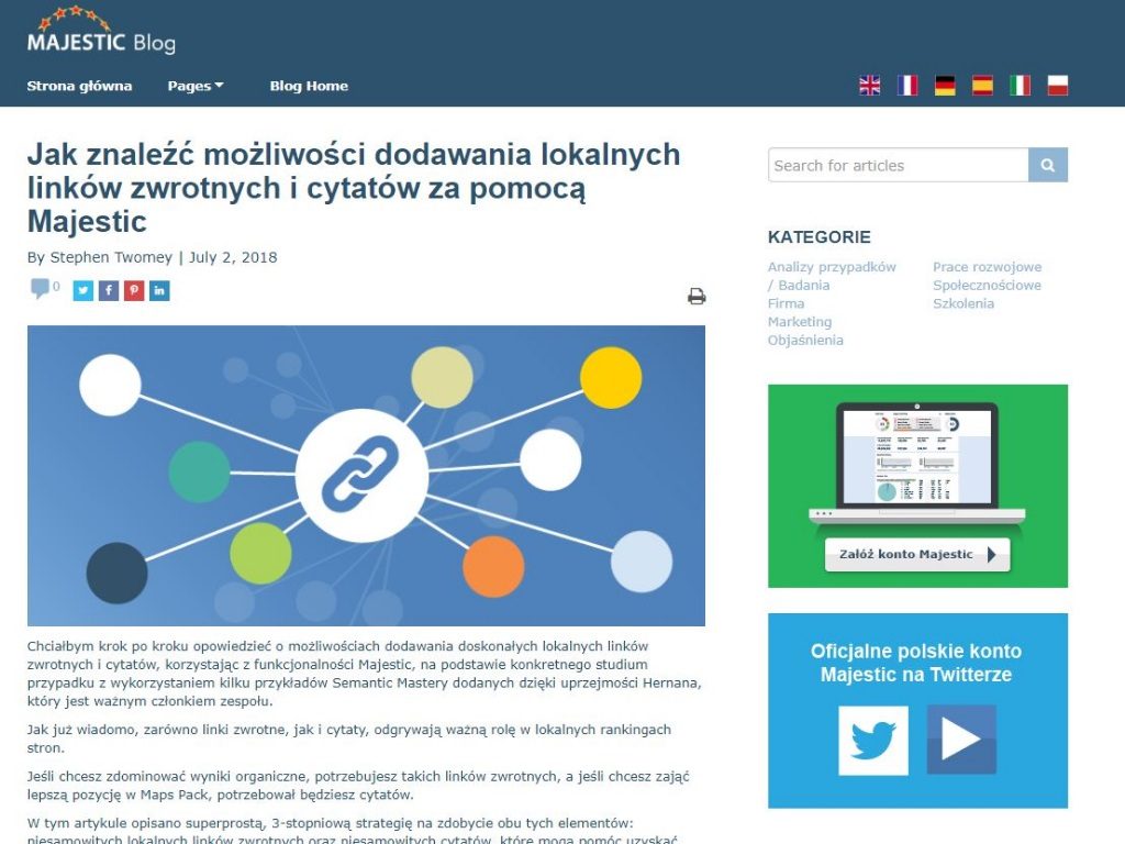 Blog Majestica, kolejnego obok Ahrefsa narzędzia do analizy profilu linków, to dobre źródło zarówno dla zdobywających wiedzę o SEO, jaki i dla tych, których interesują informacje o aktualizacjach narzędzia, co wiąże się często z nowymi szansami na rozwój własnej strony. Wpisy skoncentrowane są wokół link buildingu i możliwości, jakie oferuje w tym zakresie Majestic. Nie brakuje artykułów podpowiadających, jak za pomocą narzędzia poprawić wyniki SEO.