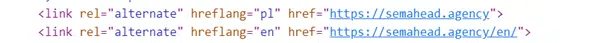 - HTML – jako link w nagłówku HTML czyli tak jak w przypadku strony Semahead. Atrybut hreflang wybieramy ze znormalizowanej nomenklatury ISO –ISO 639-1. Inną opcją jest również skorzystanie z ISO 3166-1 alfa 2. Tym niemniej nazwa kraju musi wystąpić w ustandaryzowanym skrócie: tutaj podane skórty https://en.wikipedia.org/wiki/List_of_ISO_639-1_codes. Podajemy kraj poprzez kod państwowy, np. PL.