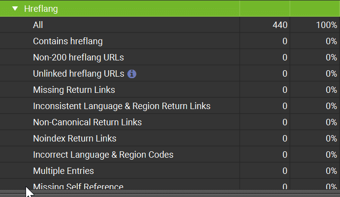 Najszybszą opcją jest wykonanie crawla przy pomocy narzędzia o nazwie Screaming Frog. Po wykonaniu crawla, przechodzimy do zakładki „hreflangi”, na którym zaprezentowane są wykresy z wyszczególnionymi podstronami z poprawnie wdrożonymi hreflangami, z pominiętymi, wylistują podstrony, gdzie nie wdrożono np. x-default oraz czy cały schemat został wdrożony poprawnie. W narzędziu wygląda to tak: