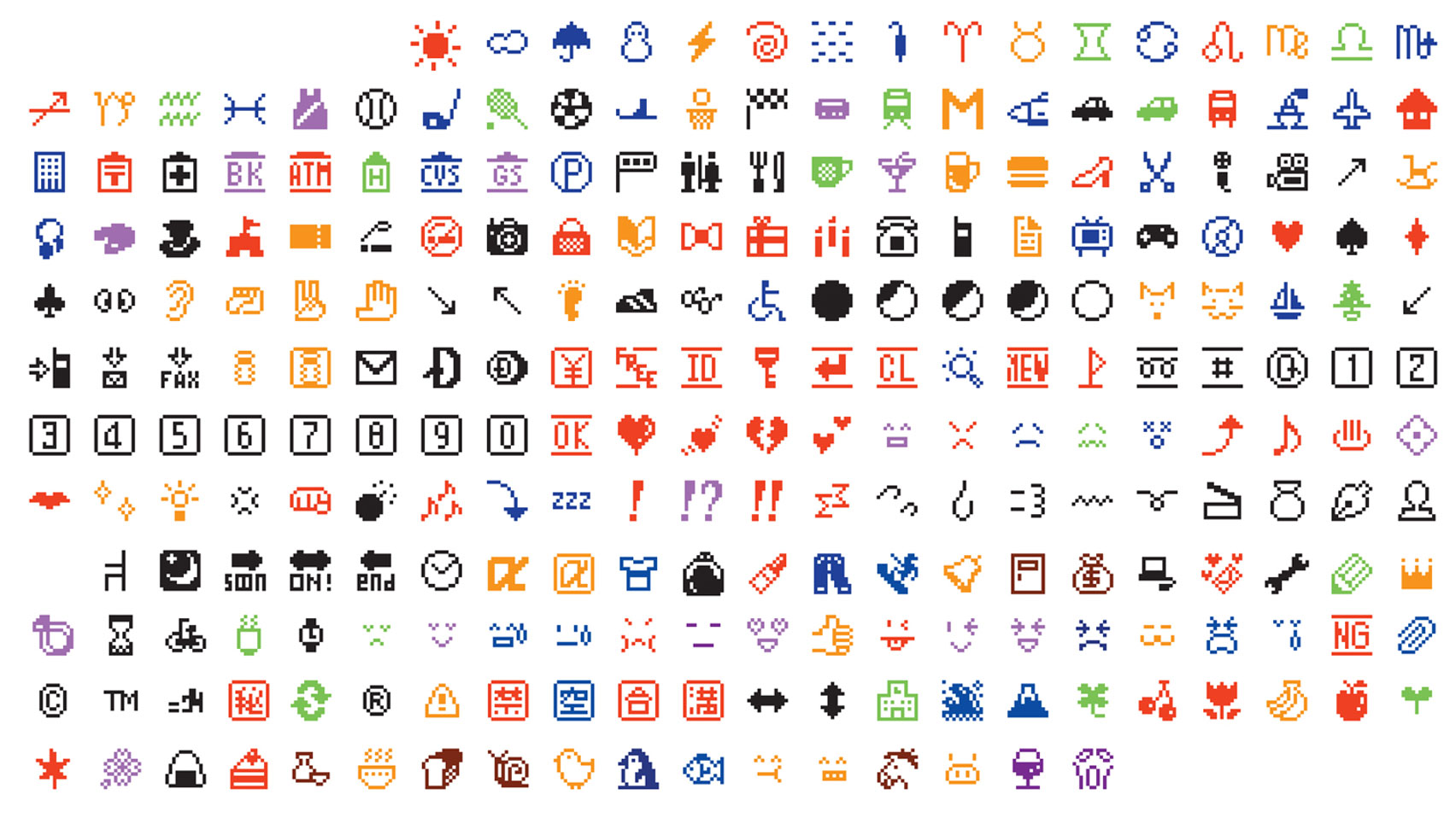 Emoji a emotikony to nie to samo. Zaskoczeni? Nie powinno się używać tych słów zamiennie, ponieważ jest różnica semantyczna między tymi dwoma graficznymi przedstawieniami. Emoji to gotowe znaki graficzne, wiele osób kojarzy je np. z żółtymi buziami np. 😘, ale mogą np. prezentować rozmaite przedmioty – kwiatki, ubrania, książki, kraje etc. Dzięki temu bogactwu przedstawień są chętnie wykorzystywane do przedstawiania w skróconej formie jakichś informacji. Nazwa emoji pochodzi z języka japońskiego. W języku japońskim „e” oznacza obrazek, a „moji” znak. Po raz pierwszy zostały oficjalnie użyte w 1999 roku i były inspirowane mangą i pismem japońskim (choć pochodzącym z Chin) Kanji. Poniżej znajdują się pierwsze na świecie emoji. Uruchamiają wspomnienia z wczesnych lat 2000, gdy to na GG piktogramami opisywaliśmy pogodę, naturę, uczucia i nastroje.
