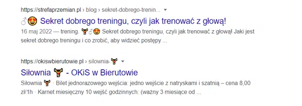 Poniżej przykłady wykorzystanych emoji w tytule i meta description: