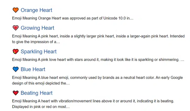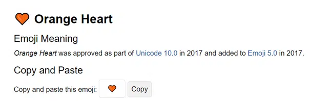 - Jeśli uznamy, że pomarańczowe serce to dokładnie to, czego chcemy dla strony, wchodzimy w w „orange heart” i klikamy „copy and paste emoji”