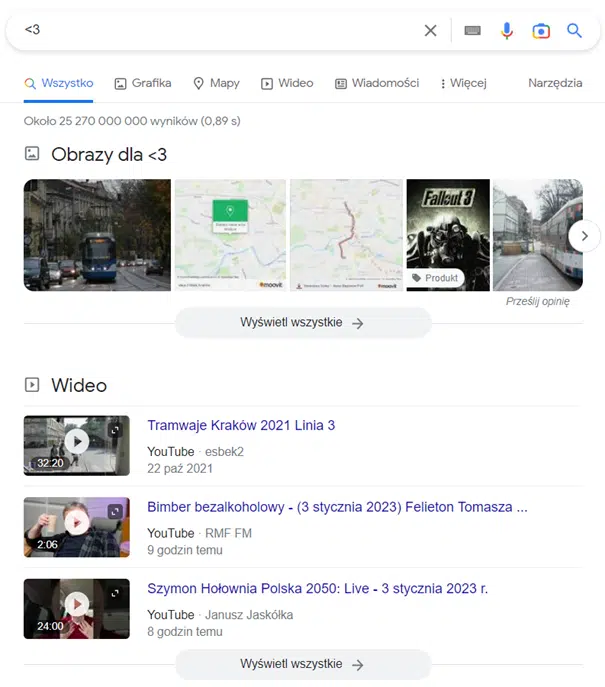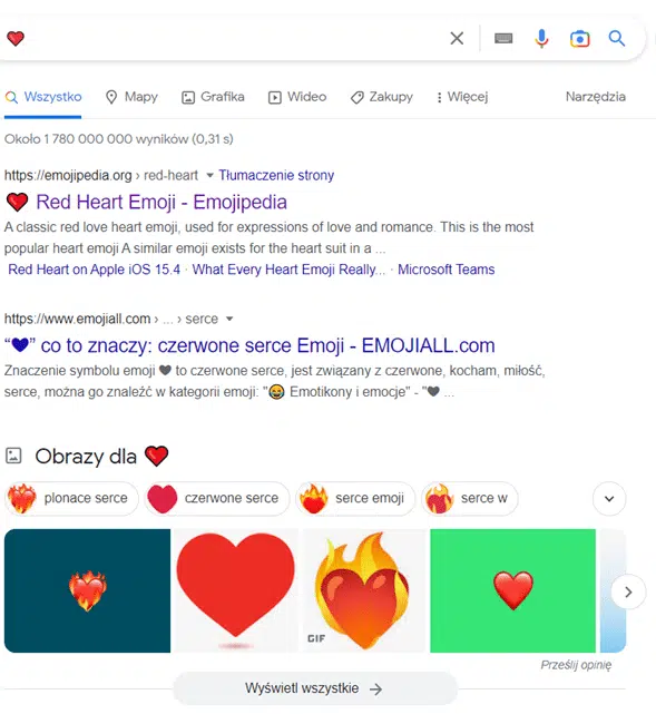 Jak widać wyniki wyszukiwania są skrajnie różne, mimo że oba zapisy znaczą mniej więcej to samo – serce. Dlatego też należy podjąć odpowiednią decyzję, w którą stronę chcemy pójść, na co się pozycjonować i na co wyświetlać. Być może zabrzmi to śmiesznie, ale decyzja o tym, czy (jeśli w ogóle) używamy emoji czy emotikonów powinna być poprzedzona analizą SERP-ów i stanowić jeden z przemyślanych elementów strategii biznesowej.