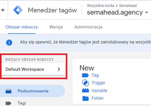 Obszary robocze pozwalają na tworzenie wielu różnych zestawów zmian w kontenerze. Oznacza to, że różni użytkownicy mogą jednocześnie pracować nad wdrożeniami różnych elementów w oddzielnych obszarach roboczych. Ułatwia to testowanie poszczególnych funkcjonalności na stronie i wychwytywanie błędów, które wpływają na niepoprawne zbieranie danych w narzędziu.