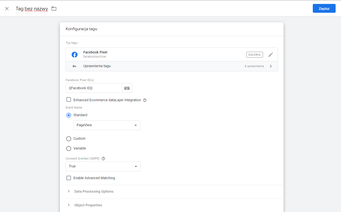 Po zapisaniu zmiennej możesz jej używać we wszystkich zdarzeniach GA. Jeśli posiadasz kilka usług GA, wówczas warto w nazwie tagu zaznaczyć z jakim ID mamy do czynienia, np. Ustawienia Google Analytics UA-11111.