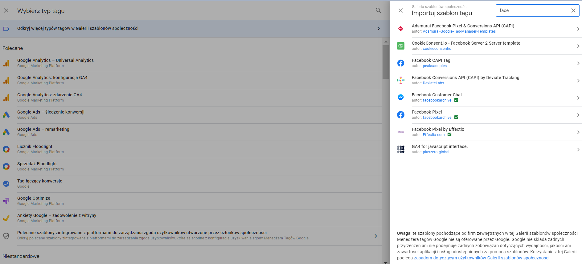 Tagi dla innych narzędzi, takich jak Facebook możesz wdrożyć poprzez wybranie tagu niestandardowy kod HTML i wklejenie w nim odpowiedniego kodu. Możesz jednak zauważyć, że w galerii społeczności Google Tag Manager pojawia się coraz więcej szablonów niestandardowych, z których warto korzystać. Są one łatwiejsze w użyciu niż fragment kodu JavaScript oraz mniej podatne na błędy: