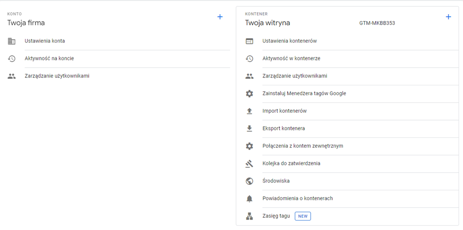 W obrębie jednego konta możesz utworzyć kilka kontenerów. Każdy z nich ma własny kod JavaScript, który trzeba dodać w kodzie strony. Google rekomenduje, aby dana firma korzystała z jednego konta i jednego kontenera na witrynę. Jest to uzasadnione tym, że w miarę rozwoju konta obsługa kilku kontenerów może stać się uciążliwa, no i w jednym kontenerze możesz dodać tagi dla różnych narzędzi, nie musisz do tego tworzyć osobnych kontenerów 😉