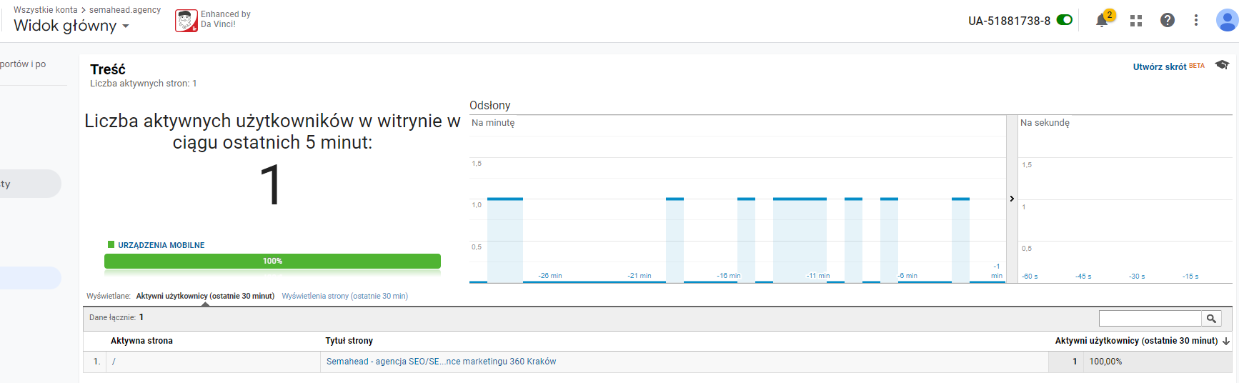 Niezależnie od tego jakie zmiany wprowadziłeś w kontenerze Google Tag Managera, zawsze je testuj przed publikacją. Pomoże Ci w tym tryb podglądu GTM. Po publikacji nowych tagów, sprawdź w panelu danego narzędzia czy faktycznie dane się zbierają. W Universal Analytics możesz użyć do tego raportu w czasie rzeczywistym: