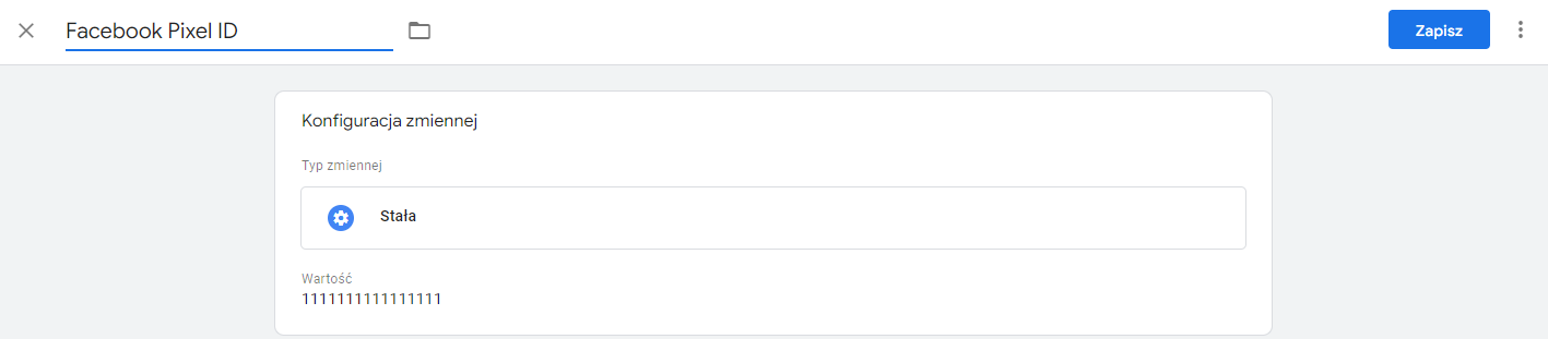 Co jeśli w swoim kontenerze Google Tag Manager oprócz tagów Google Analytics chcesz skonfigurować również sporą liczbę zdarzeń dla narzędzia Facebook? Jeśli korzystasz z szablonu tagu Facebook Pixel, musisz wprowadzić ten sam identyfikator śledzenia w każdym tagu. Jest to niezbyt optymalne działanie, prawda? Łatwo popełnić błąd i stracisz również na tym mnóstwo czasu. Ale nie martw się, jest na to rozwiązanie 🙂 Proponujemy Ci skorzystanie ze stałych zmiennych. Aby ją skonfigurować, przejdź do Zmienne > Nowa > Stała. Nazwij ją odpowiednio i wklej właściwą wartość ID: