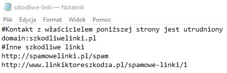 Kiedy mamy już wybrane pojedyncze linki oraz domeny, które chcemy zgłosić, możemy przystąpić do przeniesienia ich do pliku .txt, przy czym należy pamiętać o zachowaniu kodowania UTF-8. W pliku powinny znajdować się jedynie te linki, których chcemy się zrzec. Jeśli używamy również domen, to dodajemy w odpowiednim wierszu komendę: „domain:”. Plik może również zawierać nasze komentarze na temat danych linków. Należy tutaj pamiętać o rozpoczynaniu w takim przypadku wiersza z użyciem symbolu „#”. Poniżej znajduje się przykładowy plik, gotowy do przesłania w Google Disavow: