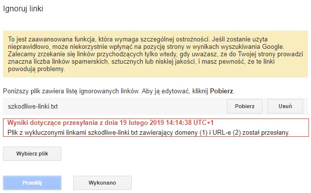Po kliknięciu w przycisk „Ignoruj linki” zostaniemy dodatkowo zapytani, czy na pewno chcemy użyć tej funkcji. Klikamy odpowiedni przycisk i następnie możemy wybrać plik z naszego dysku. Po jego przesłaniu otrzymamy informację o tym, czy narzędzie mogło poprawnie zinterpretować przesłane mu dane. Poniżej widzimy, że program wykrył 1 szkodliwą domenę oraz 2 szkodliwe linki. Wszystko się zgadza, więc możemy kliknąć „Wykonano”. Powinniśmy wówczas na naszą skrzynkę mailową otrzymać powiadomienie o tej operacji z Google Search Console.