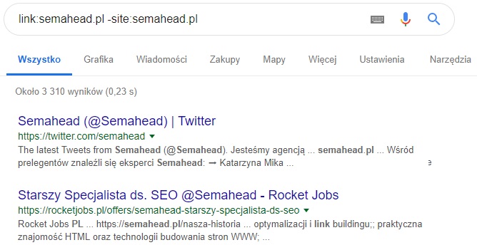 Innym, szybkim sposobem na sprawdzenie linków przychodzących, jest wpisanie komendy „link:domena.pl -site:domena.pl” do wyszukiwarki Google. Dzięki niej otrzymamy listę stron, na której pojawia się link do naszej witryny. Nie jest to wygodna i szybka metoda, jednak może zapewnić nam szybki dostęp do wiedzy na temat losowej próbki odnośników, prowadzących na przykład do naszej konkurencji. Należy pamiętać, że linki nie są ułożone według ich „mocy” czy istotności.