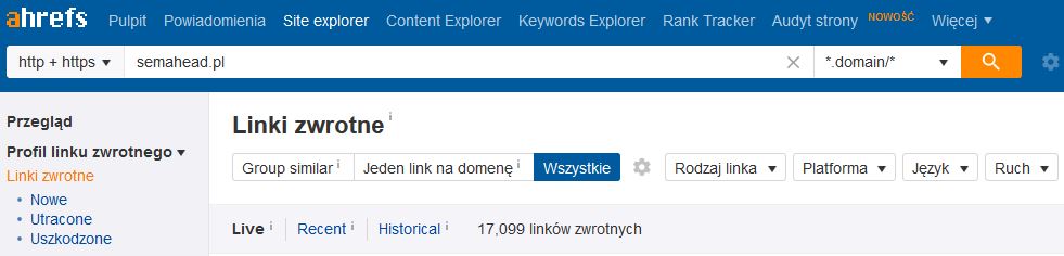 Chcąc skorzystać z raportu linków kierujących do danej domeny, użyjemy tutaj sekcji „Linki zwrotne”. Możemy tutaj wybrać wszystkie odnośniki lub tylko jeden link na domenę (co znacząco może ograniczyć ich liczbę do analizy).