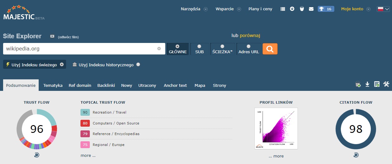 Majestic, podobnie jak Ahrefs, jest narzędziem płatnym, jednak pozwala na wypróbowanie niektórych jego funkcji po zarejestrowaniu. Po wpisaniu adresu domeny, którą chcemy sprawdzić, otrzymujemy podstawowe informacje o wskaźnikach jej dotyczących.