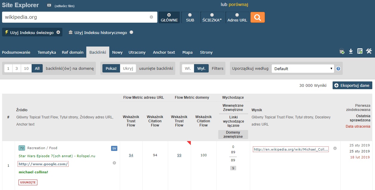 Mamy wówczas pogląd na to, skąd pochodziła część linków. Może się okazać, że były cenne i warto pomyśleć nad ich ponownym pozyskaniem. Kiedy już pozyskaliśmy oczekiwane dane, możemy kliknąć przycisk „Eksportuj dane”, dzięki któremu wygenerujemy odpowiedni raport. Podobnie, jak w przypadku Ahrefsa, uzyskamy w Excelu informacje na temat każdego linka, które pozwolą nam na ich wstępną selekcję. Narzędzi do badania linków przychodzących jest oczywiście więcej, jednak opisałem jedynie te najbardziej popularne.