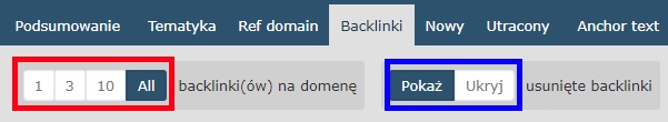 Po przejrzeniu części z nich możemy wygenerować raport na podstawie jednego, trzech, dziesięciu lub wszystkich backlinków na domenę (czerwona ramka). Możemy również stworzyć listę bogatszą o linki już nieistniejące na danych stronach (niebieska ramka).