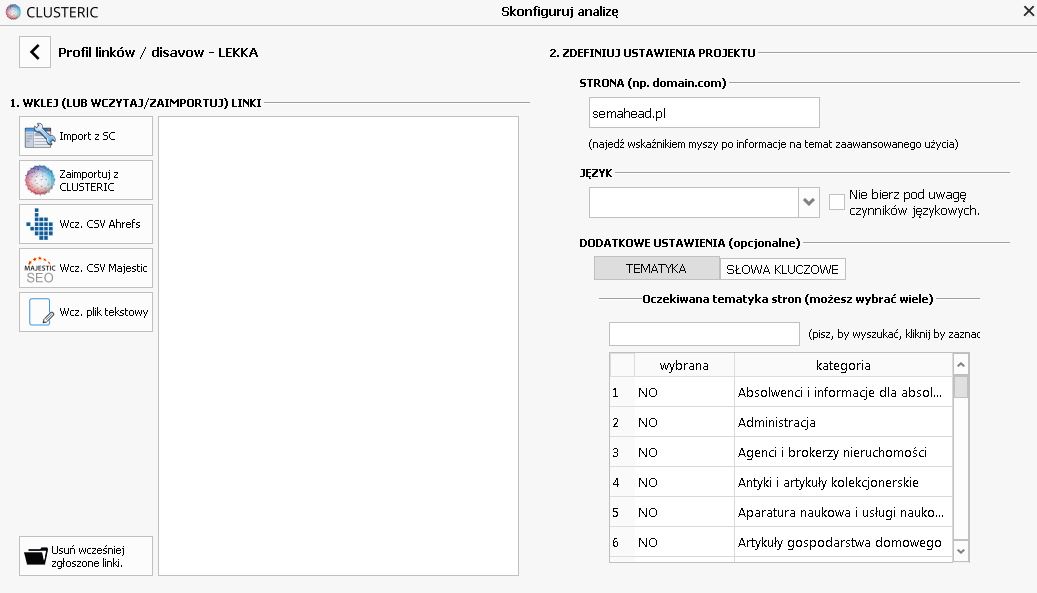 Wiele z wymienionych przeze mnie powyżej wskaźników i parametrów linków oraz domen uzyskamy zbiorczo, wykorzystując do analizy program Clusteric, o którym wspominałem wcześniej. Mając listę linków z GSC, Majestica, Ahrefsa lub innych narzędzi możemy wkleić je bezpośrednio do Clusterica i pozwalając mu na „lekką” lub „ciężką” analizę profilu linków. Poniżej znajduje się przykładowy widok z ustawiania lekkiej analizy przed jej wykonaniem:
