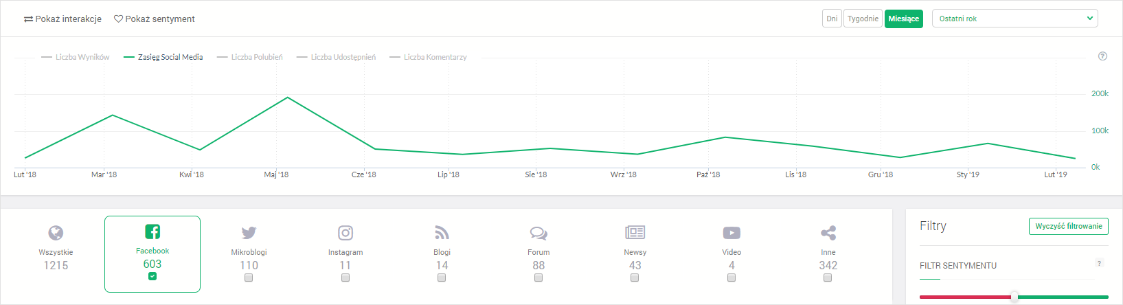 Przykład narzędzia i jego wykorzystanie: Brand24 => sprawdź, jaki szacowany zasięg i liczbę polubień na Facebooku lub Instagramie miała w ciągu ostatnich 12 miesięcy Twoja konkurencja.