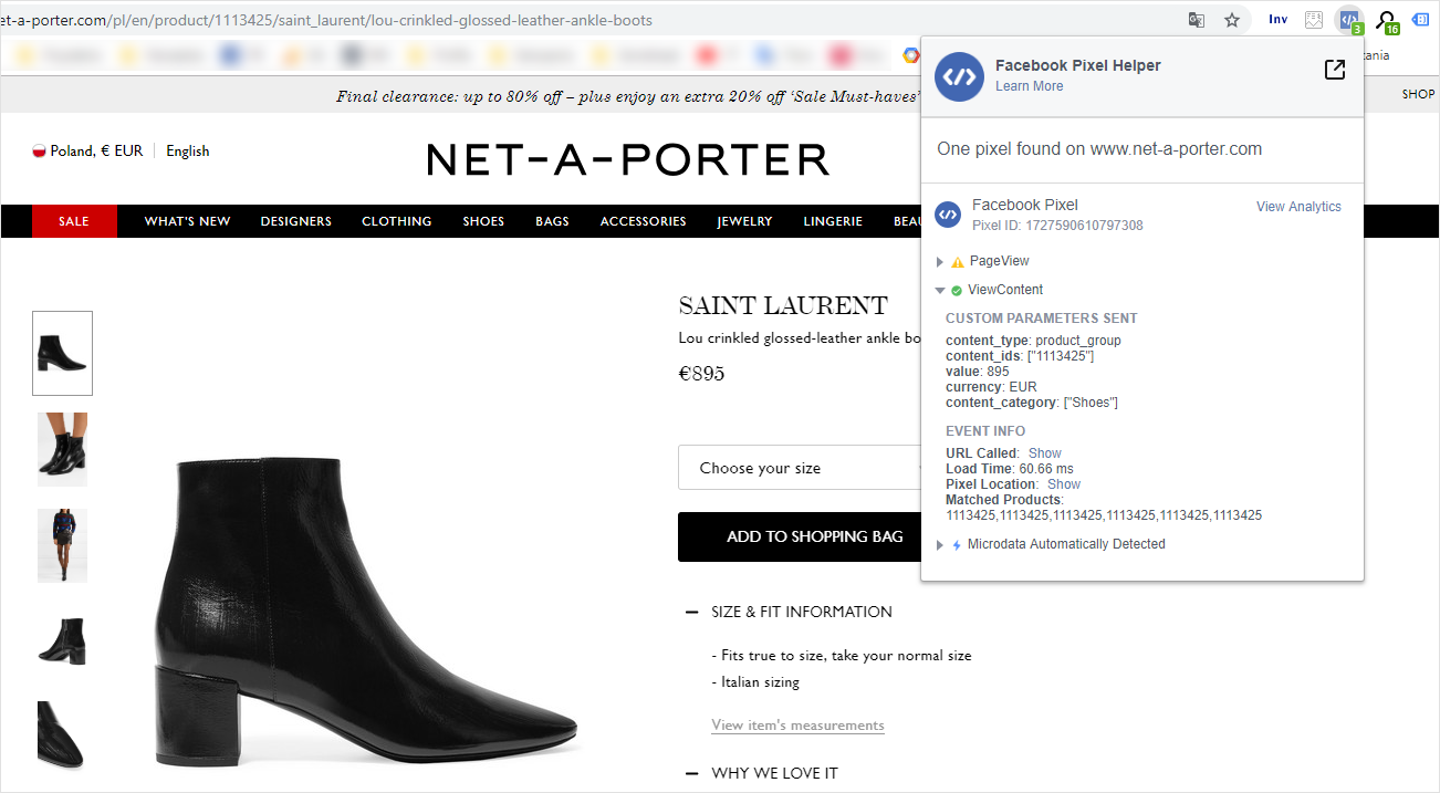 Przykład narzędzia i jego wykorzystanie: Facebook Pixel Helper => zainstaluj wtyczkę i sprawdź, czy Piksel Facebooka poprawnie monitoruje wszystkie zdarzenia na Twojej stronie oraz zaciąga dynamicznie wartości poszczególnych parametrów (np. content_ids lub value, które powinny być takie same jak wyświetlane na karcie produktu oraz w katalogu produktów wgranym do Facebooka).