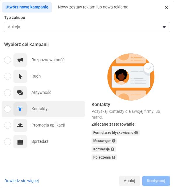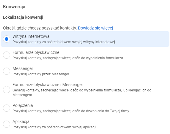Dzięki kampaniom na Facebooku leady można pozyskiwać na różne sposoby. Podstawowy podział, to pozyskiwanie kontaktów na stronie i wewnętrznie na Facebooku oraz platformach powiązanych. Przed redukcją liczby celów, te dwa sposoby miały swoje osobne cele – konwersje oraz pozyskiwanie kontaktów. Obecnie wszystkie wszystkie opcje związane z pozyskiwaniem leadów znajdziemy pod jednym celem Kontakty.