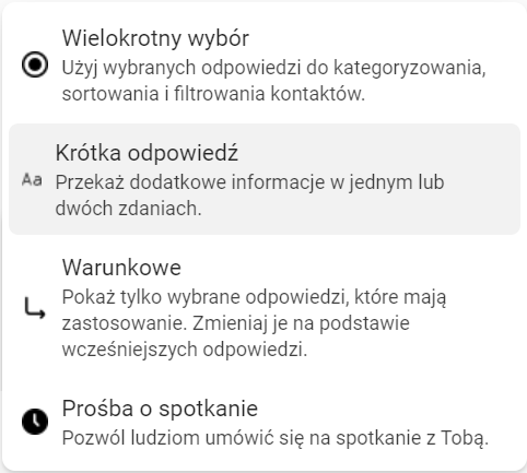 Następnie przechodzimy do pytań. Tutaj możesz skorzystać z różnych opcji pytań niestandardowych, z pytań wielokrotnego wyboru, krótkiej odpowiedzi, warunkowe, jest też opcja umówienia się na spotkanie.