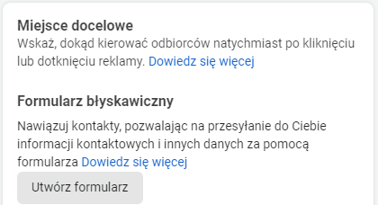 Formularz kontaktowy tworzymy na poziomie reklamy. Aby stworzyć formularz kontaktowy przechodzimy do sekcji Miejsce docelowe, Formularz błyskawiczny i klikamy w przycisk Utwórz formularz.