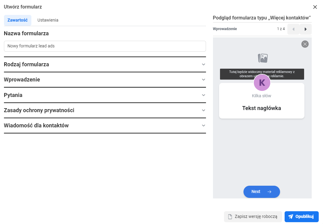 Na początek zaczynamy od nazwy formularza, ważne, żeby umożliwiała ona później łatwe odszukanie. Często przydaje się również dodanie nazwy kampanii, by w sytuacji, gdy tworzymy nową kampanię z innym formularzem łatwo był odróżnić skąd pochodzą kontakty.