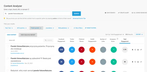 Po drugie – BuzzSumo. Sprawdzisz w nim, jaki content jest najbardziej angażujący. Zaangażowanie mierzone jest liczbą udostępnień, komentarzy i reakcji contentu w social mediach. Wystarczy, że wpiszesz interesującą Cię frazę, zawęzisz wyszukiwania (np. o wybrany język i zakres czasowy), a narzędzie wskaże Ci, jakie treści najskuteczniej pobudzały odbiorców do zaangażowania.