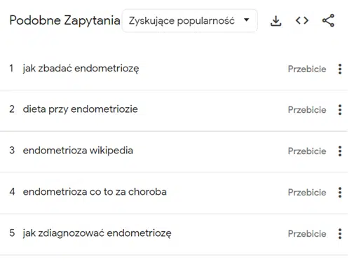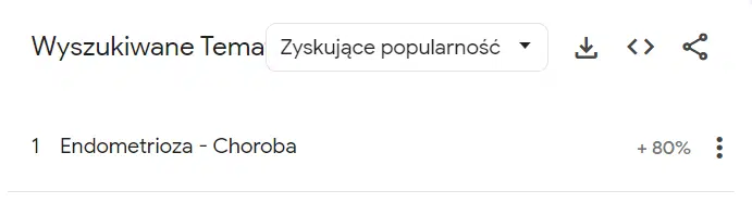 Wpisując konkretną frazę, dowiesz się, jakie konkretne wątki interesują użytkowników – poniżej przykład dla zyskującej na popularności w ciągu ostatnich 30 dni frazy „endometrioza”. Wzrost popularności dobrze widać na wykresie z ostatnich 12 miesięcy. Masz też możliwość porównania popularności kilku fraz.