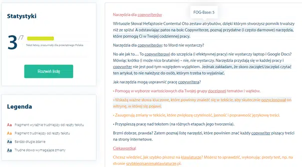 Poniżej przykład działania Jasnopisu. I tu ciekawostka: mimo że współczynnik FOG (indeks czytelności tekstu) słowa „copywriter” jest wysoka, to test jest kierowany osób związanych z marketingiem, które doskonale je rozumieją, zatem zmienianie go mijałoby się z celem.