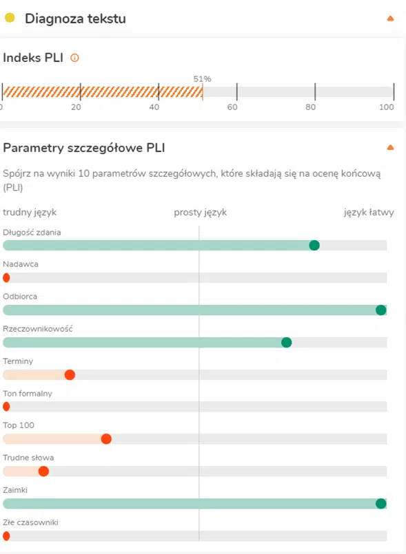 Drugim narzędziem jest Logios. Aplikacja ta – podobnie jak Jasnopis – analizuje tekst pod kątem trudności, wykorzystując tzw. indeks PLI (Plain Language Index), na który składa się 10 parametrów. To m.in.: