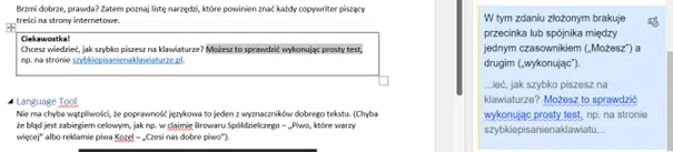 Co ważne, Language Tool nie zawsze poda Ci konkretne poprawienie błędu – czasem po prostu wskaże, że błąd „gdzieś jest, lecz nie wiadomo, gdzie” albo zauważy prawdopodobną pomyłkę, która niekoniecznie nią jest. Dlaczego o tym piszę? Aby przypomnieć Ci, że finalna odpowiedzialność za poprawność językową leży po Twojej stronie, a bez znajomości reguł językowych nie będziesz w stanie poprawić tekstu, nawet jeśli będziesz świadomy/świadoma, że według narzędzia są w nim błędy.