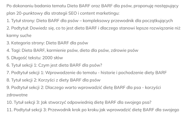 Podział na sekcje jest poprawny, choć z tezą o wyższości BARF-u nad suchą karmą można dyskutować. Może być też ona sprzeczna z interesami marki, na stronie której chcemy ją umieścić, np. blogu producenta/sprzedawcy karmy dla psów. Pominęłabym również wątek historyczny, który przeczy zasadzie odwróconej piramidy. I choć obroniłby się jako naprawdę krótkie wprowadzenie, to jednak jest to mało istotny wątek poboczny, który można pominąć bez straty wartości tekstu.
