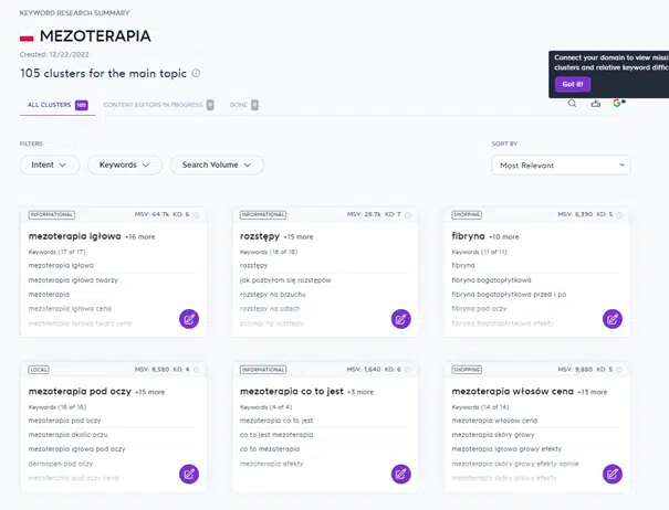 Warto wspomnieć o Surferze SEO. Poza sprawdzeniem potencjału fraz zaproponuje pogrupowanie podobnych słów kluczowych (lub powiązanych) w klastry, które możesz wykorzystać jako niemal gotowe pomysły na tematy, np. na firmowy blog.