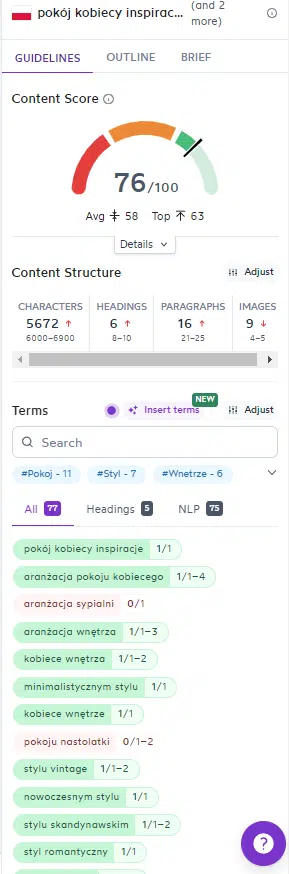 Surfer SEO posiada również edytor – teksty możesz więc tworzyć bezpośrednio w aplikacji, która zasugeruje Ci długość treści, liczbę akapitów, zdjęć czy nagłówków. Content editor zweryfikuje też liczbę wystąpień konkretnych fraz w artykule. Po napisaniu treści możesz sprawdzić jej content score – współczynnik opisujący w skali od 1 do 100 jakość i trafność contentu. To bardzo ciekawe narzędzie, które z pewnością może wesprzeć SEO copywriterów.
