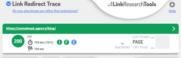 Darmową opcją są również wtyczki do Google Chrome np. Link Redirect Trace, która pokazuje kod odpowiedzi, indeksowalność danej podstrony oraz ewentualny canonical nałożony na podstronę: