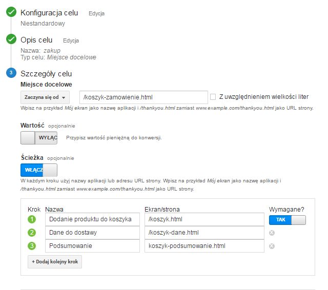 Do tych skonfigurowanych jako miejsce docelowe istnieje możliwość dodania ścieżki, która przedstawia kolejno strony odwiedzane przez użytkownika przed dotarciem do celu. Ostatnim krokiem w ścieżce jest cel, który skonfigurowaliśmy wypełniając pole „miejsce docelowe”.