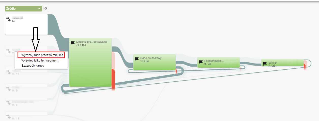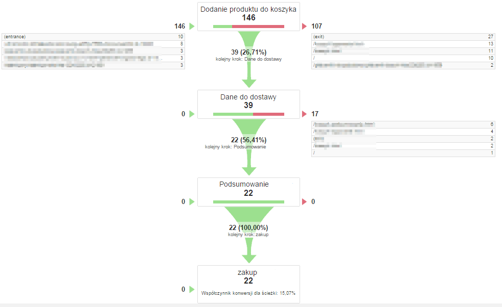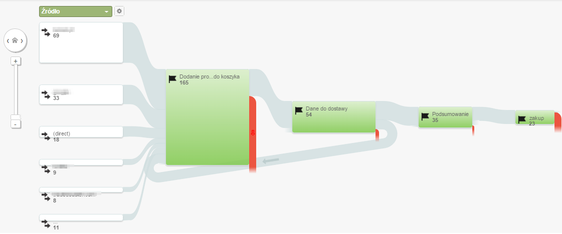 Czerwone pola przy poszczególnych krokach oznaczają bezpowrotne wyjście ze ścieżki; najeżdżając na nie kursorem mamy wgląd na liczbę tych wyjść. Z kolei najeżdżając na wybrane połączenie pomiędzy krokami ścieżki, możemy sprawdzić liczbę przejść do kolejnego kroku lub liczbę powrotów do poprzedniego.
