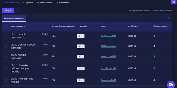 Na zapytanie „bluza hoodie damska” Senuto daje nam podpowiedzi, jakie jeszcze frazy dodatkowe powiązane z tematem są warte zainteresowania: