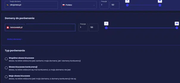 Możemy wybrać, co chcemy zobaczyć: wspólne słowa kluczowe, czyli takie na które jesteśmy widoczni mi oraz nasi konkurenci; słowa kluczowe konkurencji, które są jednym z bardziej przydatnych modułów, ponieważ daje informacje, które frazy kluczowe można jeszcze zagospodarować w serwisie – stanowią one coś w rodzaju potencjalnego content planu, czyli wiemy, o jakie treści należy uzupełnić serwis, by być realną konkurencją, a nie tylko potencjalną.