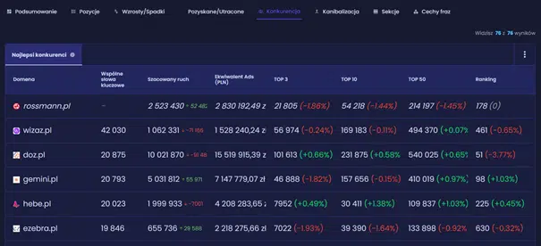 Na stronie „analizy widoczności” znajdują się ogólne dane, jeśli jednak chcemy przeanalizować naszą pozycję na rynku SEO i określić jak duży „kawałek tortu” przypada właśnie nam to, to możemy przejść do zakładki „konkurencja”. Otrzymujemy tu bardzo konkretne informacje, kto zyskuje, kto traci i gdzie jesteśmy w krajobrazie branży.