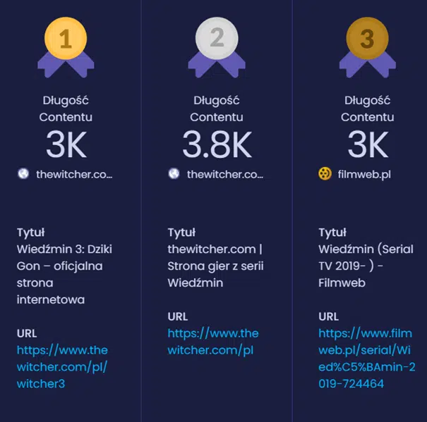 Co możemy z tego wyciągnąć? Np. jeśli większość stron w SERP ma bardzo długą treść, to wiemy, że nie pokonamy ich dwoma zdaniami o Geralcie z Rivii. Posiadając tę wiedzę, będziemy wiedzieć, ile minimalnie nasza treść powinna posiadać nagłówków, jakie powinniśmy konstruować tytuły, by w ostatecznym rozrachunku wygenerować wyższą widoczność niż nasza konkurencja i osiągnąć jak najwyższe wyniki w wyszukiwarce.