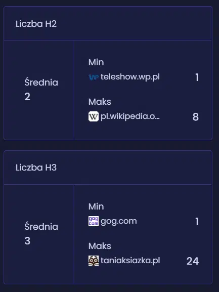 Z informacji na temat SERP-u możemy również wyciągnąć wiedzę, że w artykułach o Wiedźminie najczęściej pojawiają się trzy H3 i dwie H2, czyli do czegoś podobnego powinniśmy dążyć. Czy można więcej? Naturalnie! Czy można mniej? Nie jest to wskazane…