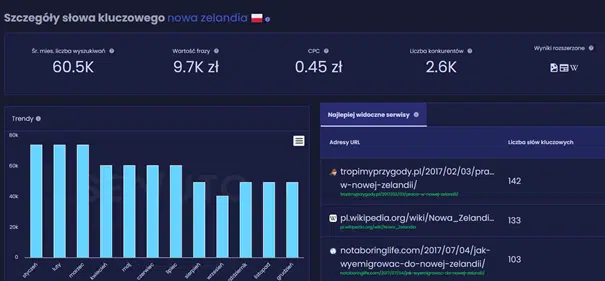 Na wykresie możemy zobaczyć, jak do tej pory wyglądała sezonowość danej frazy – czy fraza zwykle jest wyszukiwania częściej na początku roku, może w wakacje a może jesienią? Wszystko to zobaczymy na wygodnym wykresie słupkowym. Oprócz tego, dowiemy się, jak prezentuje się aktualny SERP czyli to jakie strony Google wybrał jako perfekcyjną odpowiedź na dane zapytanie. Widzimy, że pierwszą pozycję na frazę „Nowa Zelandia” ma strona tropimyprzygody.pl, następna zaś jest Wikipedia i to z nimi musielibyśmy ewentualnie konkurować w razie gdybyśmy chcieli osiągnąć wysoką pozycję na frazę “nowa zelandia”. Od tego co jest aktualnie w wynikach wyszukiwania zależy to jak będziemy kształtować treść na naszej stronie.