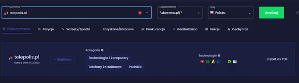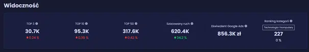 Po wpisaniu domeny widzimy już od razu, jak na jak wiele fraz kluczowych jest widoczna strona – ile fraz ma w TOP 3, TOP 10 i TOP 50 oraz jaki jest estymowany ruch.