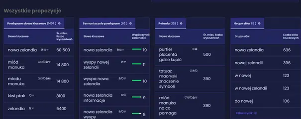 Oprócz takich informacji dostajemy cały zasób rozmaitych fraz kluczowych, które można wykorzystać w treściach o Nowej Zelandii: