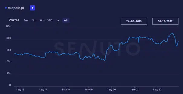 Widoczność serwisu jest przedstawiona na wykresie, który pozwala na szybką weryfikację, czy widoczność strony rośnie, spada, czy też utrzymuje się na stałym poziomie.