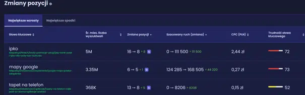 Aktualna widoczność to jedno, jednak działania specjalisty mają na celu stałe zwiększanie widoczności, a to na jakie nowe frazy kluczowe możemy zyskać widoczność. Tę informację możemy czerpać z „bazy słów kluczowych”